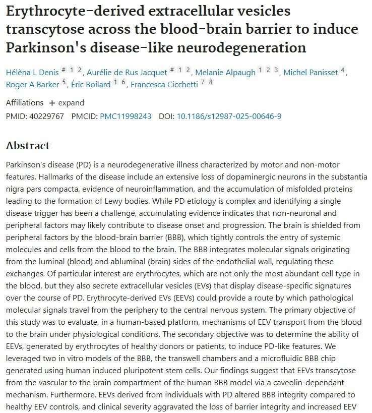 Parkinson's disease (PD) is a neurodegenerative illness characterized by motor and non-motor features. Hallmarks of the disease include an extensive loss of dopaminergic neurons in the substantia nigra pars compacta, evidence of neuroinflammation, and the accumulation of misfolded proteins leading to the formation of Lewy bodies. While PD etiology is complex and identifying a single disease trigger has been a challenge, accumulating evidence indicates that non-neuronal and peripheral factors may likely contribute to disease onset and progression. The brain is shielded from peripheral factors by the blood-brain barrier (BBB), which tightly controls the entry of systemic molecules and cells from the blood to the brain. The BBB integrates molecular signals originating from the luminal (blood) and abluminal (brain) sides of the endothelial wall, regulating these exchanges. Of particular interest are erythrocytes, which are not only the most abundant cell type in the blood, but they also secrete extracellular vesicles (EVs) that display disease-specific signatures over the course of PD. Erythrocyte-derived EVs (EEVs) could provide a route by which pathological molecular signals travel from the periphery to the central nervous system. The primary objective of this study was to evaluate, in a human-based platform, mechanisms of EEV transport from the blood to the brain under physiological conditions. The secondary objective was to determine the ability of EEVs, generated by erythrocytes of healthy donors or patients, to induce PD-like features. We leveraged two in vitro models of the BBB, the transwell chambers and a microfluidic BBB chip generated using human induced pluripotent stem cells. Our findings suggest that EEVs transcytose from the vascular to the brain compartment of the human BBB model via a caveolin-dependant mechanism. Furthermore, EEVs derived from individuals with PD altered BBB integrity compared to healthy EEV controls, and clinical severity aggravated the loss of barrier integrity and increased EEV extravasation into the brain compartment. PD-derived EEVs reduced ZO-1 and Claudin 5 tight junction levels in BMEC-like cells and induced the selective atrophy of dopaminergic neurons. In contrast, non-dopaminergic neurons were not affected by treatment with PD EEVs. In summary, our data suggest that EEV interactions at the human BBB can be studied using a highly translational human-based brain chip model, and EEV toxicity at the neurovascular unit is exacerbated by disease severity.